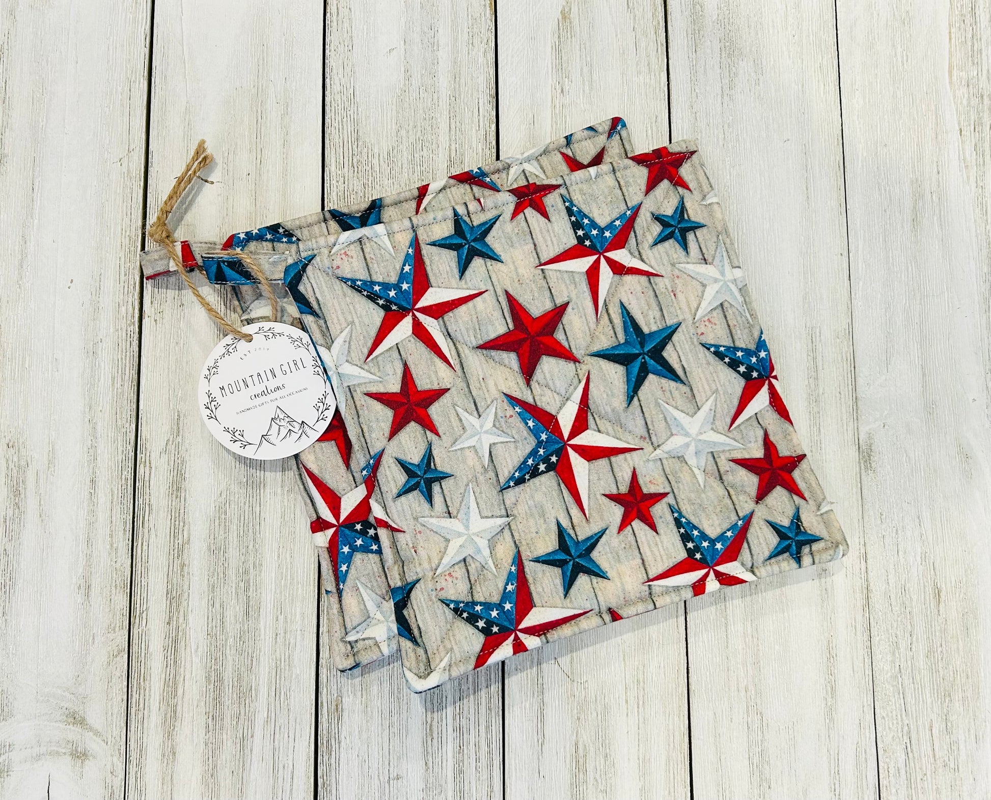 Potholder Set - Patriotic Themed - Woodgrain Stars 4th of July Potholders