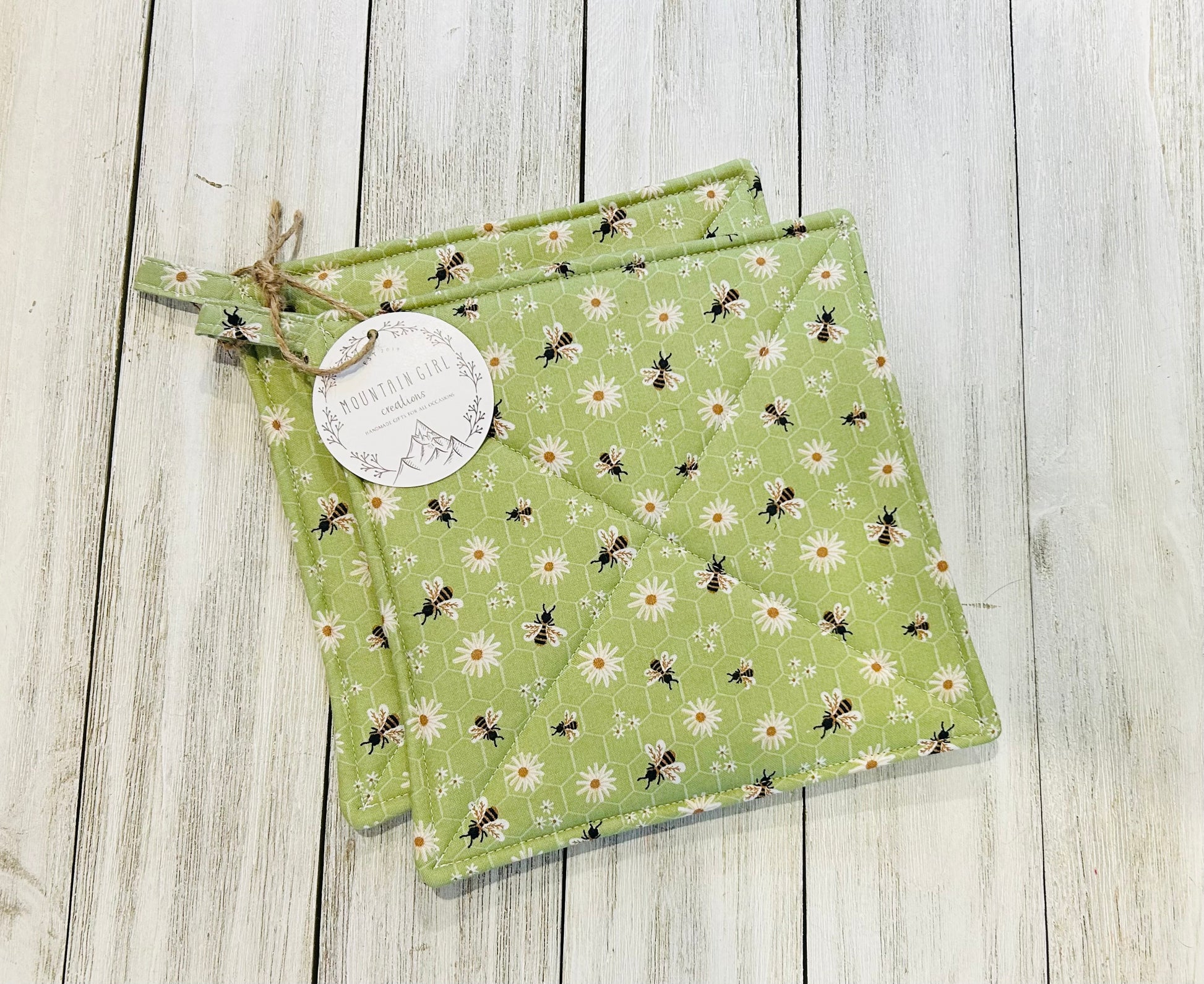 Potholder Set - Bee Themed - Daisies and Bee- Sage