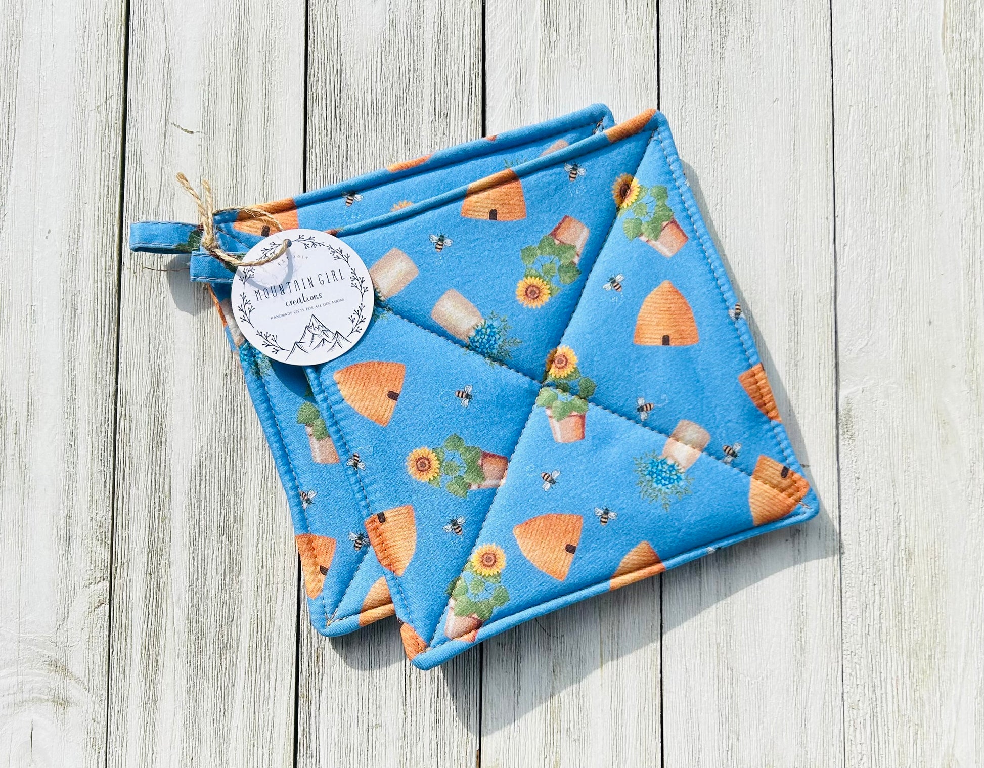 Our Set of 2 Bee Potholders are a perfect addition to your kitchen! Approximately 8x8 and are made of 1 layer of Cotton Batting and Insulbrite. These do have polyester in them, so they are not safe to use in microwave.