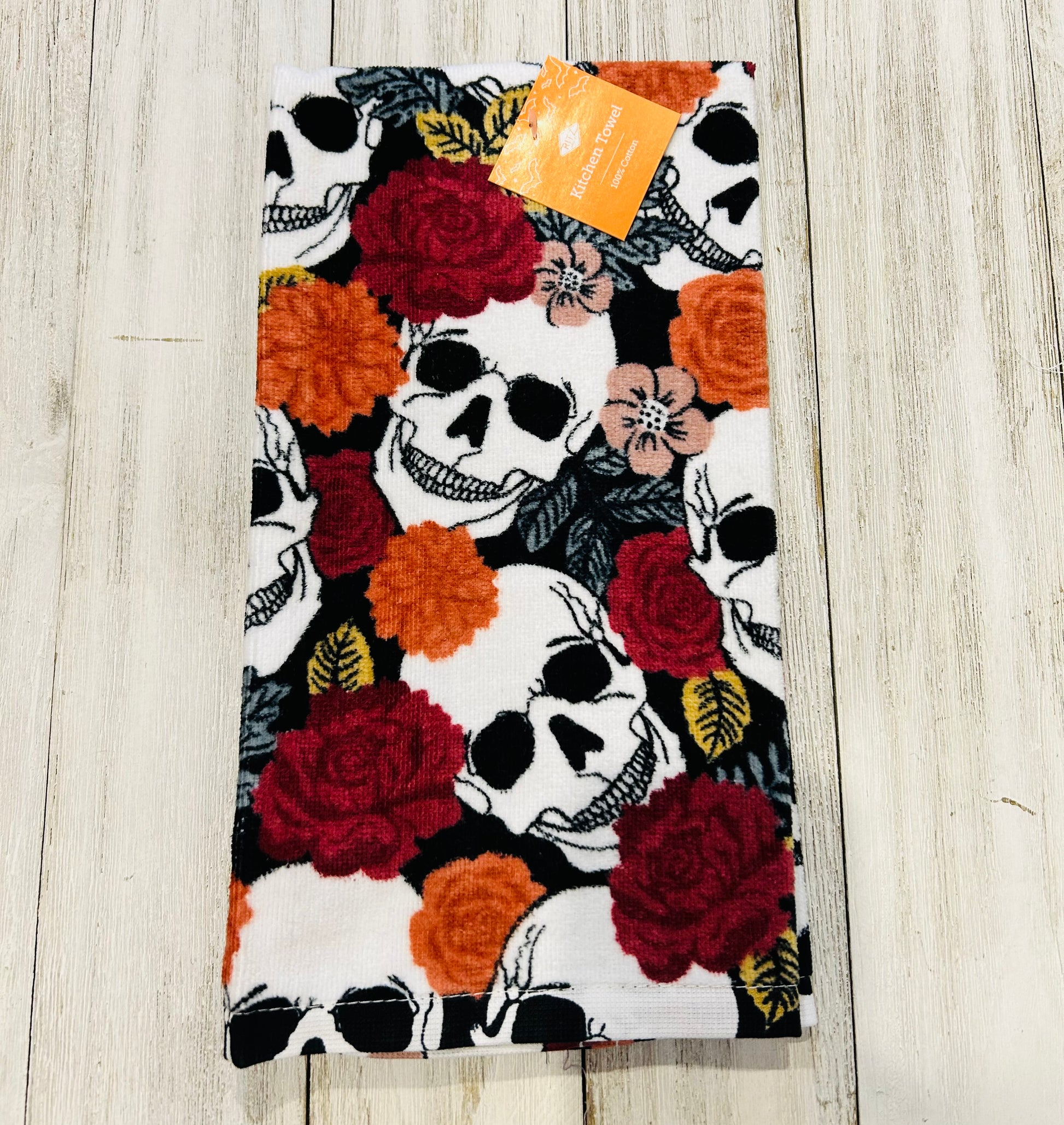 This double-sided Fiber Reactive (soft fuzzy feel) Day of the Dead Skulls towel will make a great addition to your kitchen this Spooky Season!