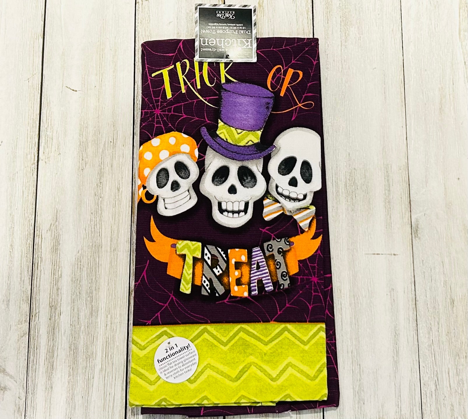 This Dual Purpose (Terry on Inside, Cotton on Outside) Trick or Treat Skulls towel will make a great addition to your kitchen this Spooky Season!