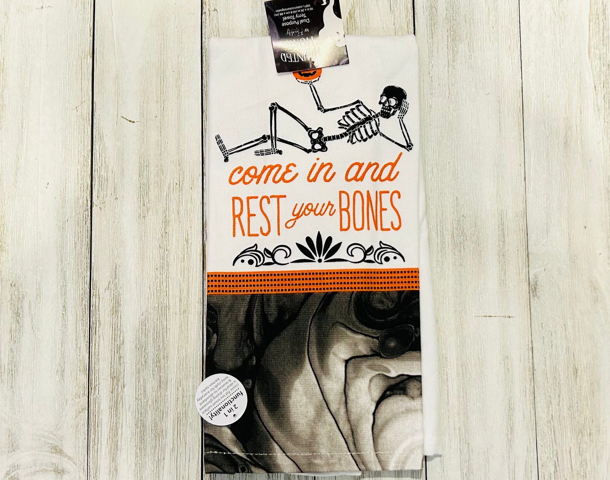 This Dual Purpose (Terry on Inside, Cotton on Outside) Come in and Rest Your Bones towel will make a great addition to your kitchen this Spooky Season!