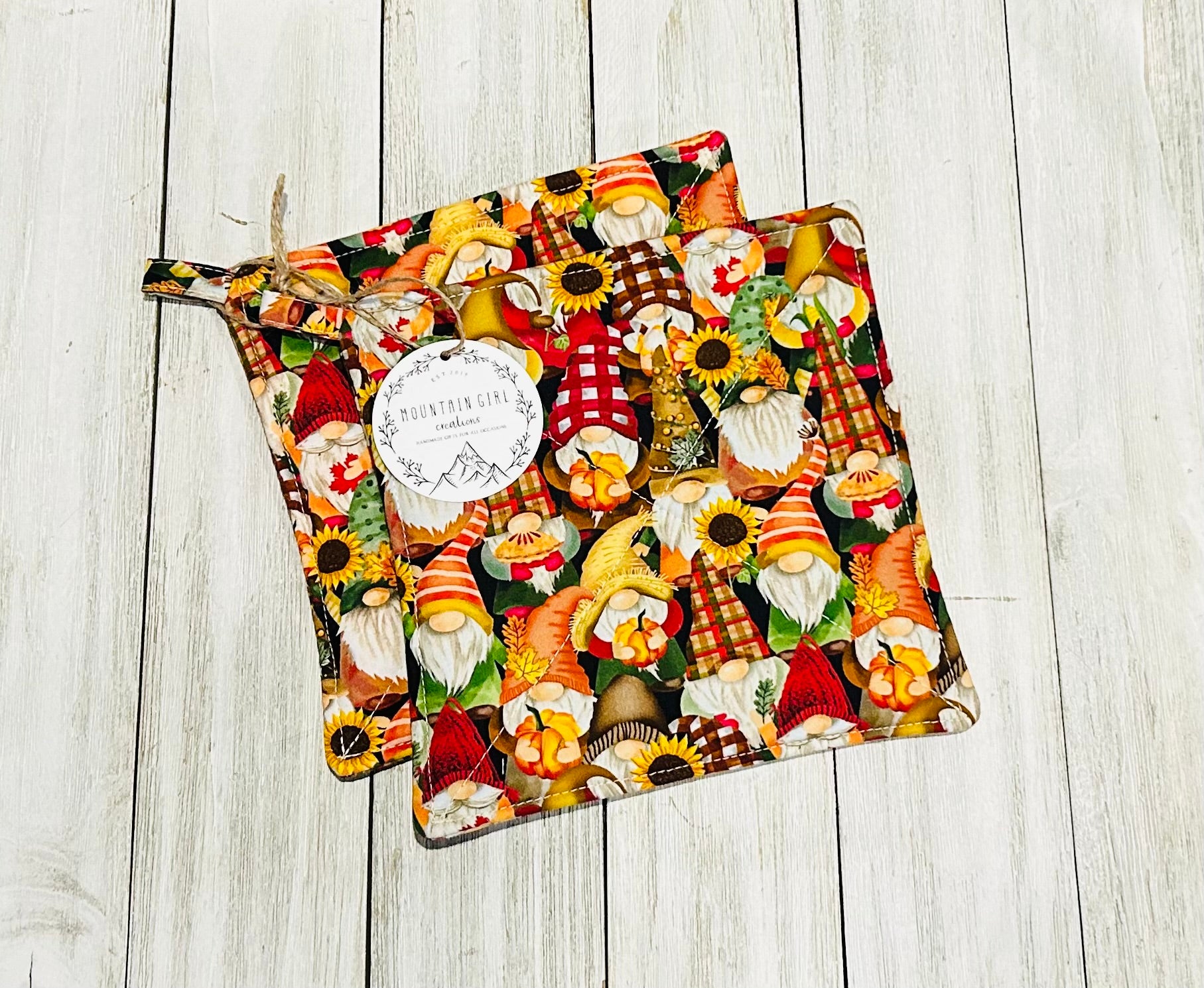 Our Set of Fall Gnome Potholders are a perfect addition to your kitchen! Approximately 8x8 and are made of 1 layer of Cotton Batting and Insulbrite. These do have polyester in them, so they are not safe to use in microwave.